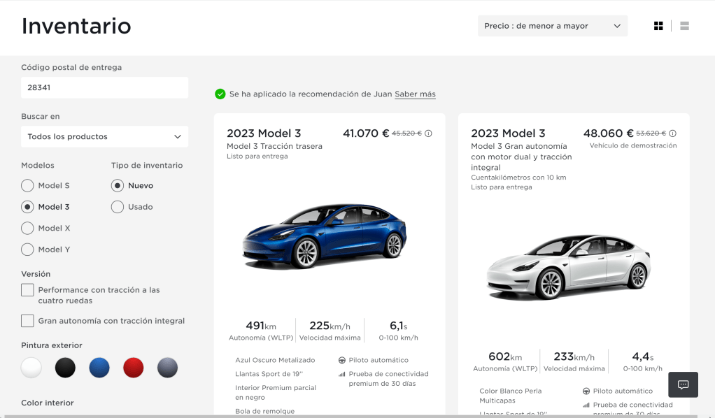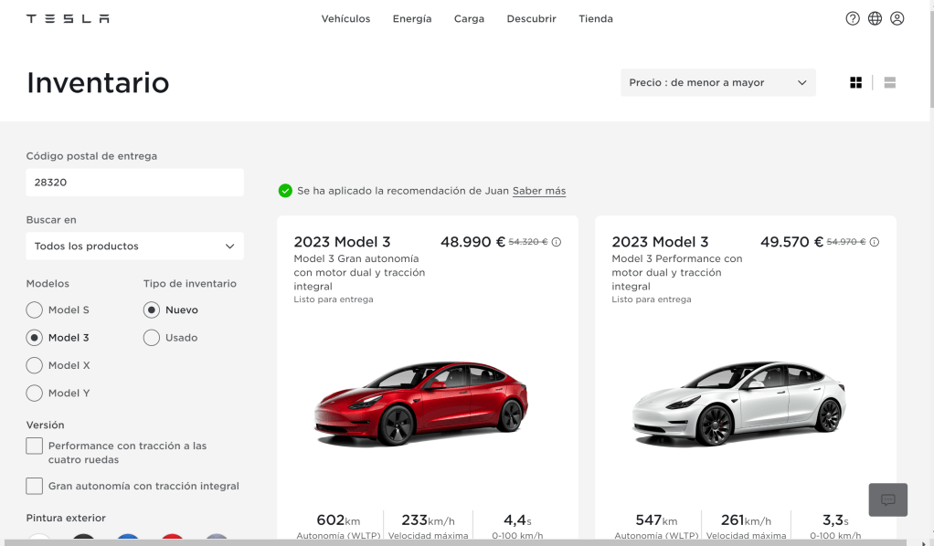 La configuración ideal sería: Model 3 Long Range RWD con exterior negro, interior blanco y con bola de remolque. Si bien, otras opciones serían perfectamente válidas, no nos vamos a poner exquisitos 😉