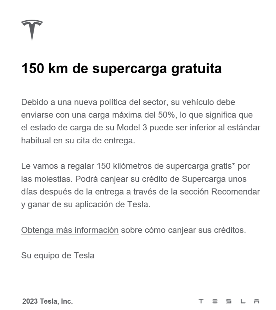 Lo que sí que me llamó la atención fue un mensaje que recibí por parte de Tesla respecto de la nueva normativa para entrega de EV donde se fija un mínimo de carga del 50%. Para cubrirse, nos «regalaron» 150 Km de carga en Supercargadores Tesla. Un detalle, la verdad.