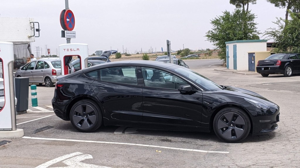 A la llegada al Supercargador de Manzanares había bastantes puestos disponibles (como la mitad creo recordar), con lo que aparqué en uno de los postes y conecté la manguera al coche. ¡Al momento comenzó la carga!