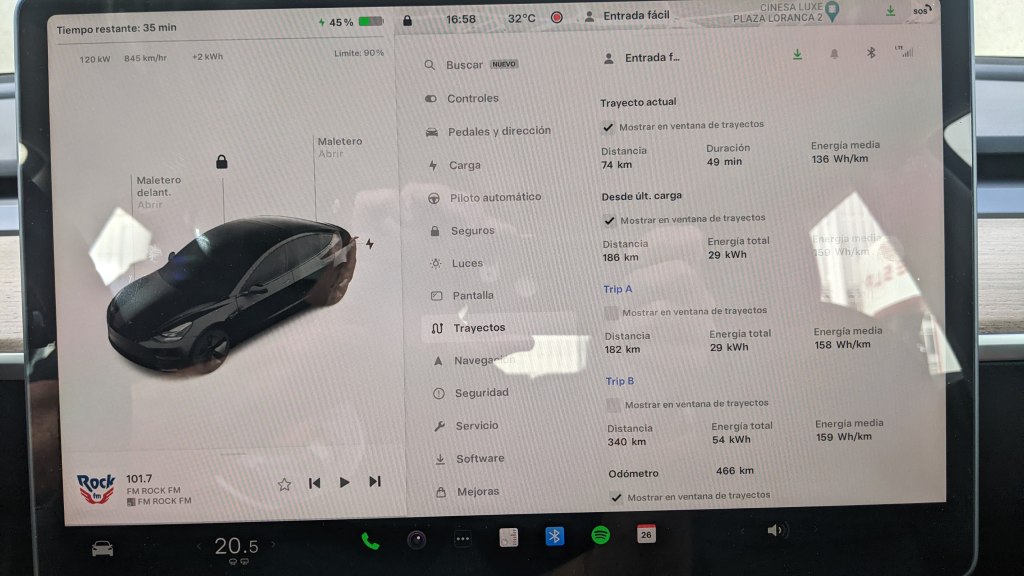 Pues un rato antes de arrancar el primer viaje hasta un Supercargador (más allá del de Fuenlabrada) revisé el modo de hacer uso de los comandos de voz. Muy útiles para activar el limpiaparabrisas, solicitar una canción en Spotify o modificar el itinerario. Para activarlo tan sólo debes pulsar la ruedecita del lado derecho del volante (o pulsar el icono de micrófono en la pantalla). El segundo punto que revisé fue cómo activar el autopilot de nivel básico que incluye nuestro Model 3 por defecto. Parece ser que algo pasé por alto porque lo único que fui capaz de usar fue el control de crucero.