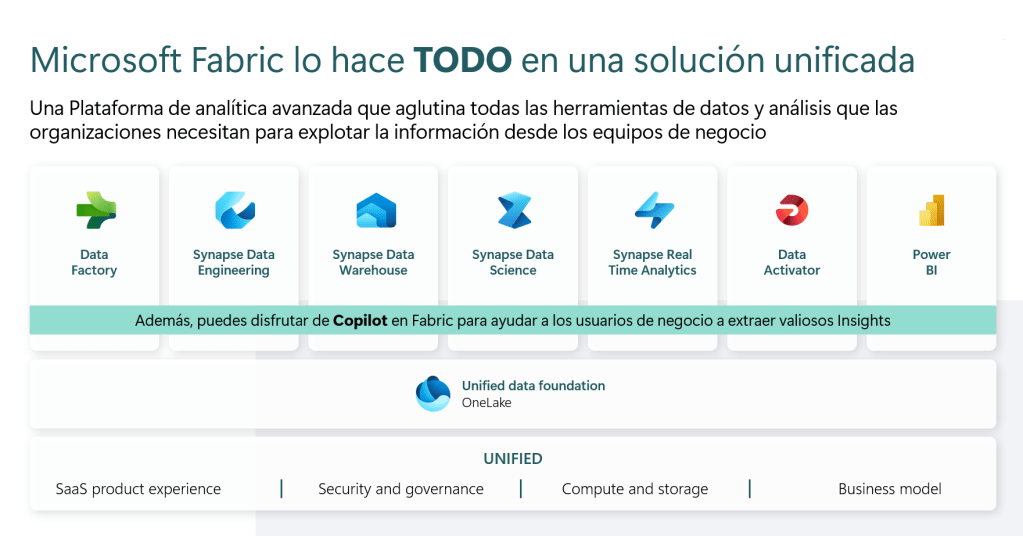 Microsoft Fabric es el «nuevo» producto de la gente de Redmon alrededor del DATO y que se distribuye en modo SaaS. Comentar que este primer punto es muy interesante, sobre todo para organizaciones que quieran tener control absoluto sobre lo que se hace y lo que no se hace con los datos en el entorno empresarial.