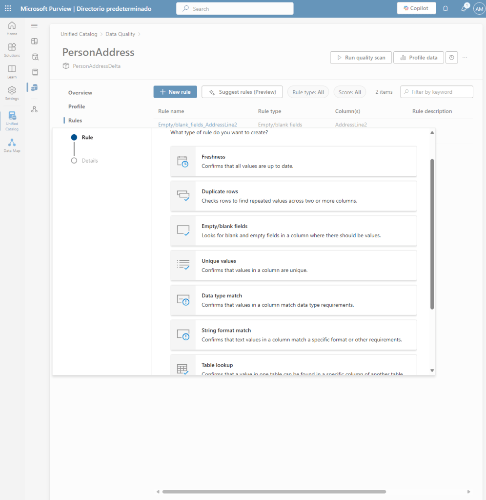 Si se pulsa sobre las reglas de calidad activas, se puede acceder al detalle de qué tipo de reglas son y sobre que conjunto de atributos actúan. En el ejemplo son reglas básicas como detectar campos vacíos o en blanco y que los valores sean únicos. Existe la posibilidad de customizar las reglas de calidad si no existe ese tipo que desees incluir e incluso Microsoft Purview dispone de un ayudante para la definición de las propias reglas de calidad.