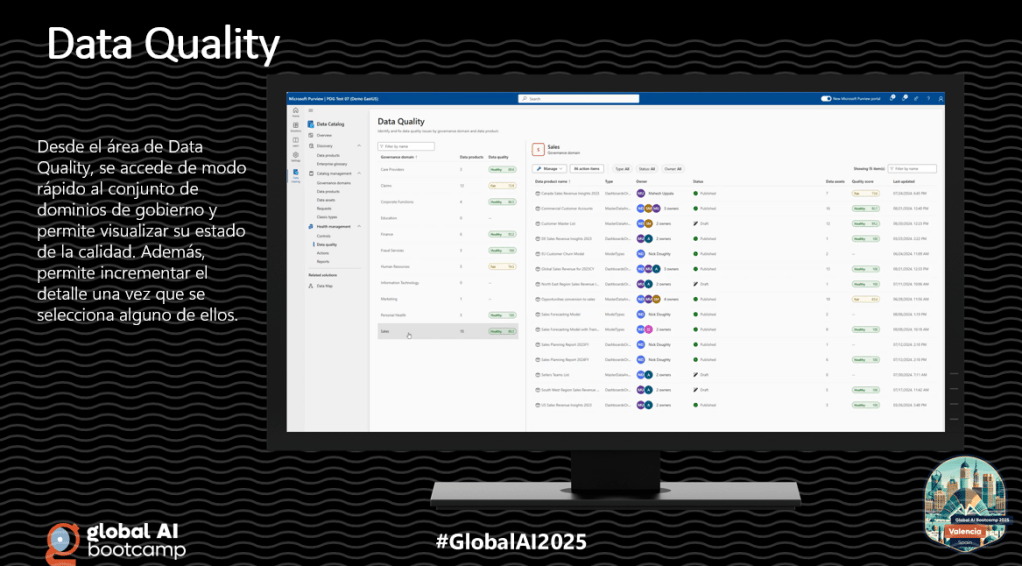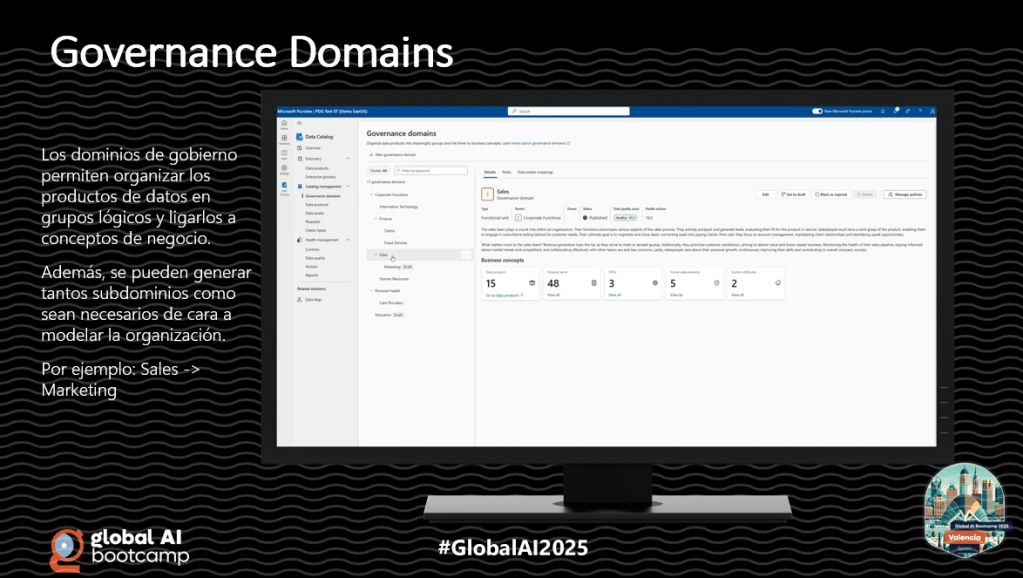 Para ello, fui comentando las capacidades que Microsoft Purview ofrece, sobre todo en la parte de Data Catalog, donde elementos como Business Domains, el enfoque de Productos de Datos y características como Critical Data Elements son tan importantes para confeccionar un Business Glossary de un modo eficiente.
