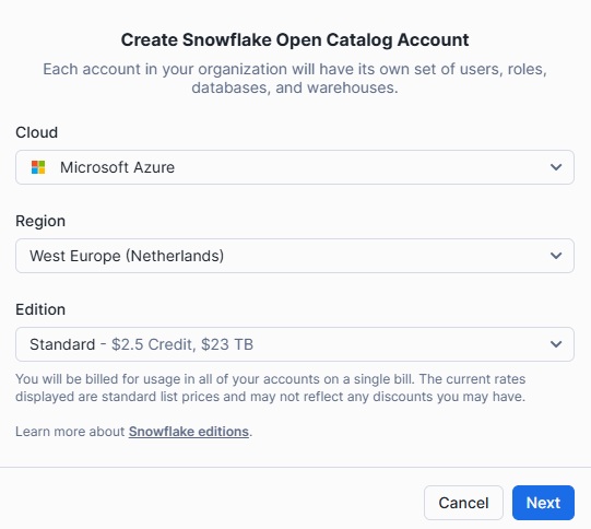 El siguiente mensaje te indica del coste del servicio. En este caso es sobre Azure y la región es la misma que la región donde desplegué mi solución de Snowflake con la cuenta trial.