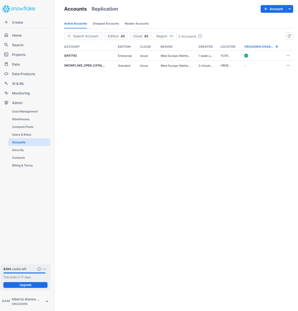 Para comenzar a usar la parte de Open Catalog conjuntamente con Snowflake tan sólo tienes que disponer de una cuenta en vigor o lanzarte a por una trial de 30 días. Lo que mejor te cuadre. Una vez dispones de la cuenta, lo siguiente es acceder a ella y pulsar sobre Admin y en un segundo paso, pulsar sobre Account para crear nuestro recurso Open Catalog