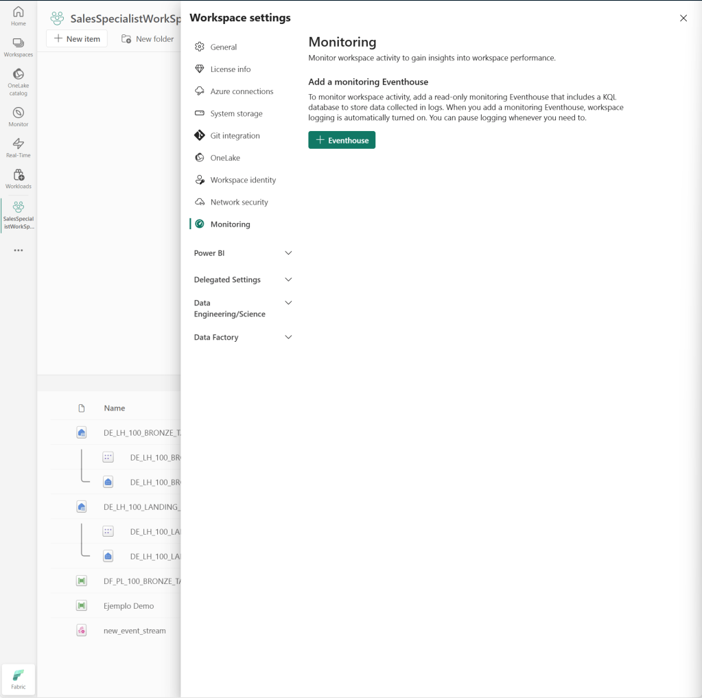 Para configurar el segundo escenario, tan sólo debes ir a la configuración del Workspace y habilitar el Eventhouse. ¡Sencillo!