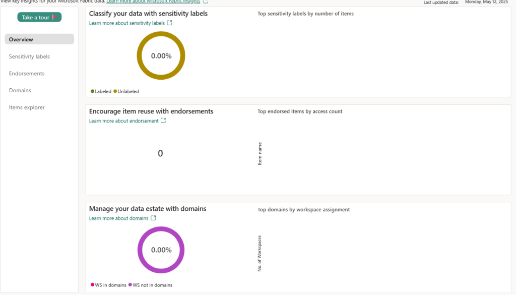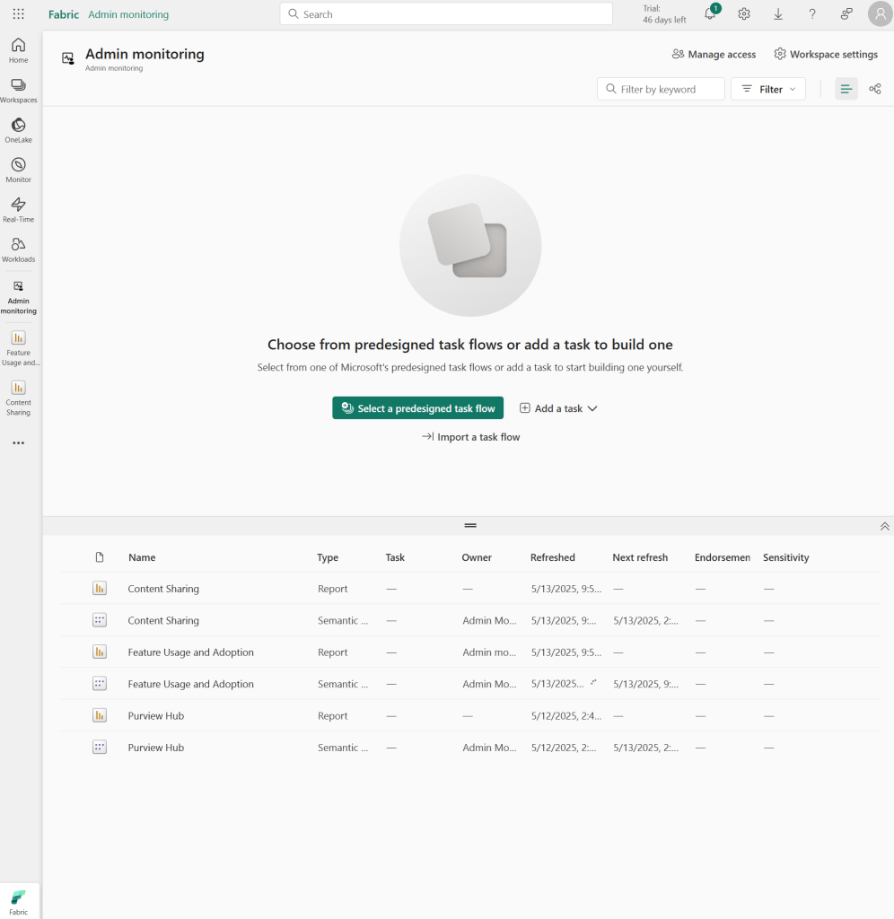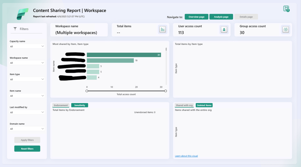Los reportes corresponden a Content Sharing, Feature Usage and Analytics y Purview Hub. El primero y el tercero ayudan a entender cómo se distribuyen y comparten los items de Fabric por la organización y gestionar y gobernar los activos de datos desde un punto centralizado respectivamente.
