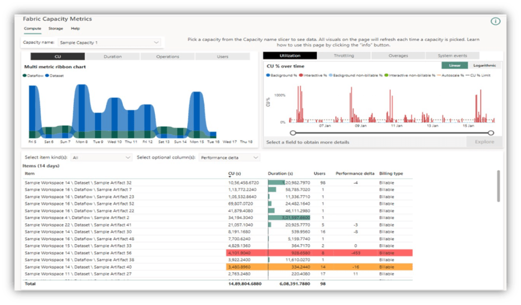 La parte de monitorización de los procesos, consumos y demás se realiza desde la instalación de la aplicación de Fabric Capacity Metrics. Esta aplicación está diseñada para ayudar a los administradores a monitorizar el consumo de la capacidad. Es decir, qué procesos consumen las Compute Units (CU) de mi capacidad. Además, permite medir el rendimiento de las cargas de trabajo y poder evaluar el total de CU empleadas durante periodos específicos de tiempo.