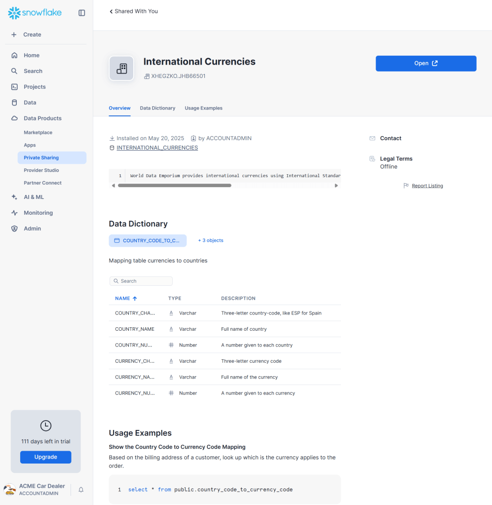 Y si accedo al detalle, puedo observar características tan interesantes como un diccionario de datos o queries de ejemplo para ayudar a entender los activos de datos compartidos.