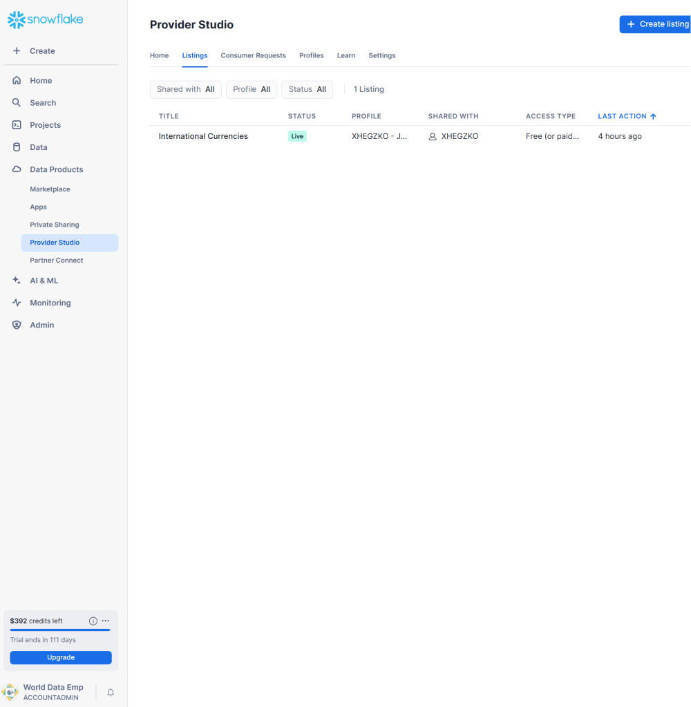 En este caso, he creado un recurso que he llamado International Currencies desde una cuenta de Snowflake en AWS