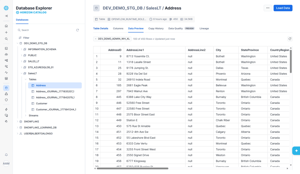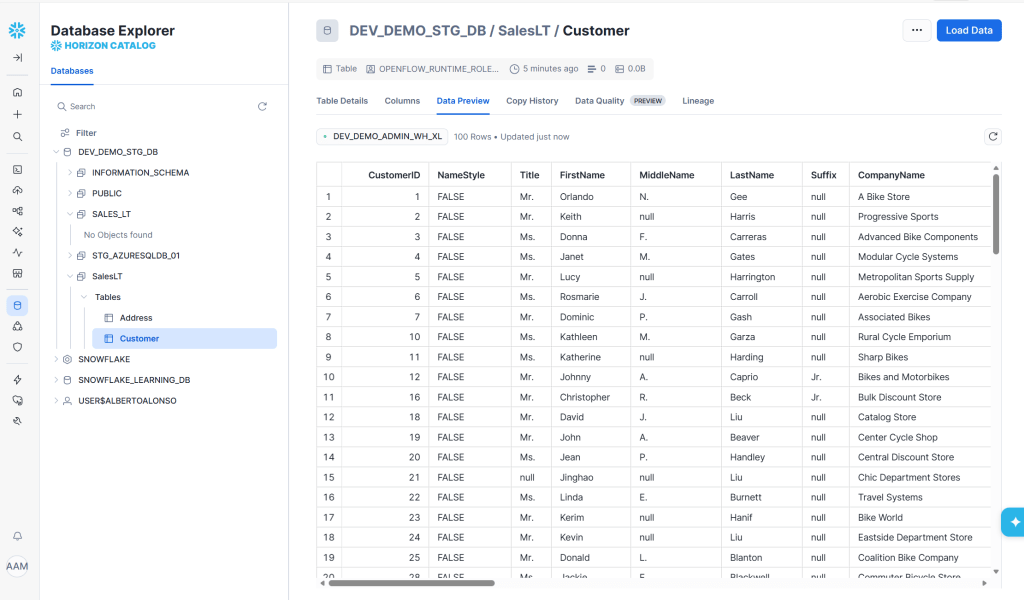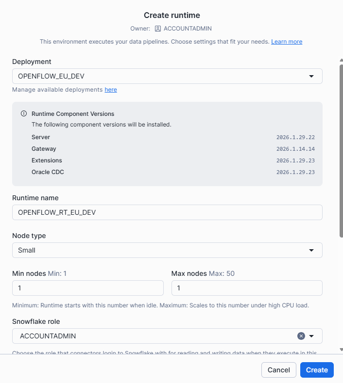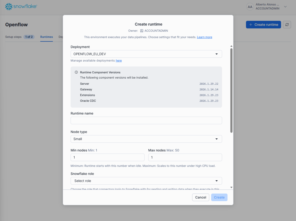 USE ROLE ACCOUNTADMIN;CREATE ROLE IF NOT EXISTS OPENFLOW_RUNTIME_ROLE_OPENFLOW_RT_EU_DEV;GRANT ROLE OPENFLOW_RUNTIME_ROLE_OPENFLOW_RT_EU_DEV TO USER ALBERTOALONSO;ALTER USER ALBERTOALONSO SET DEFAULT_ROLE = OPENFLOW_RUNTIME_ROLE_OPENFLOW_RT_EU_DEV;ALTER USER ALBERTOALONSO SET DEFAULT_SECONDARY_ROLES = ('ALL');GRANT USAGE, OPERATE ON WAREHOUSE DEV_DEMO_ADMIN_WH_XL TO ROLE OPENFLOW_RUNTIME_ROLE_OPENFLOW_RT_EU_DEV;GRANT USAGE ON DATABASE DEV_DEMO_STG_DB TO ROLE OPENFLOW_RUNTIME_ROLE_OPENFLOW_RT_EU_DEV;GRANT USAGE ON SCHEMA SalesLT TO ROLE OPENFLOW_RUNTIME_ROLE_OPENFLOW_RT_EU_DEV;