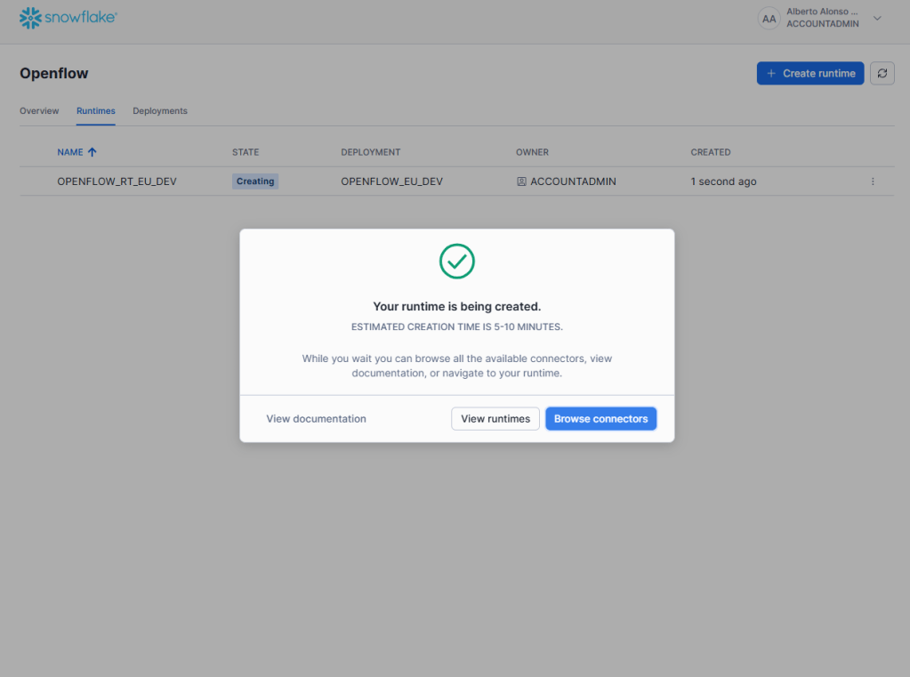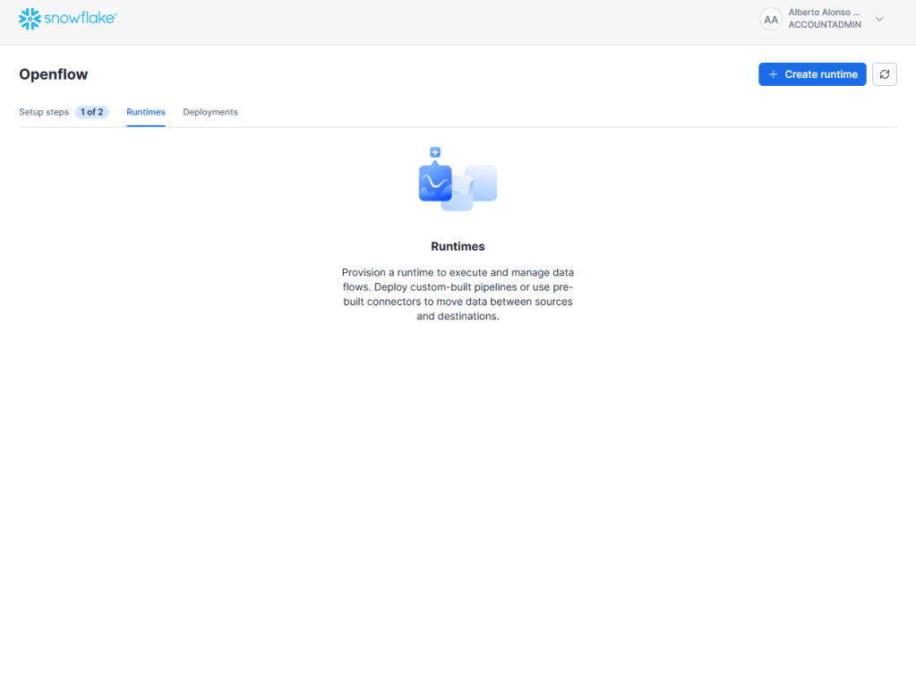 Acto seguido, se procede con la creación del runtime que nos permitirá construir los pipelines de Openflow. Se inicia pulsando sobre el botón «Create Runtime».