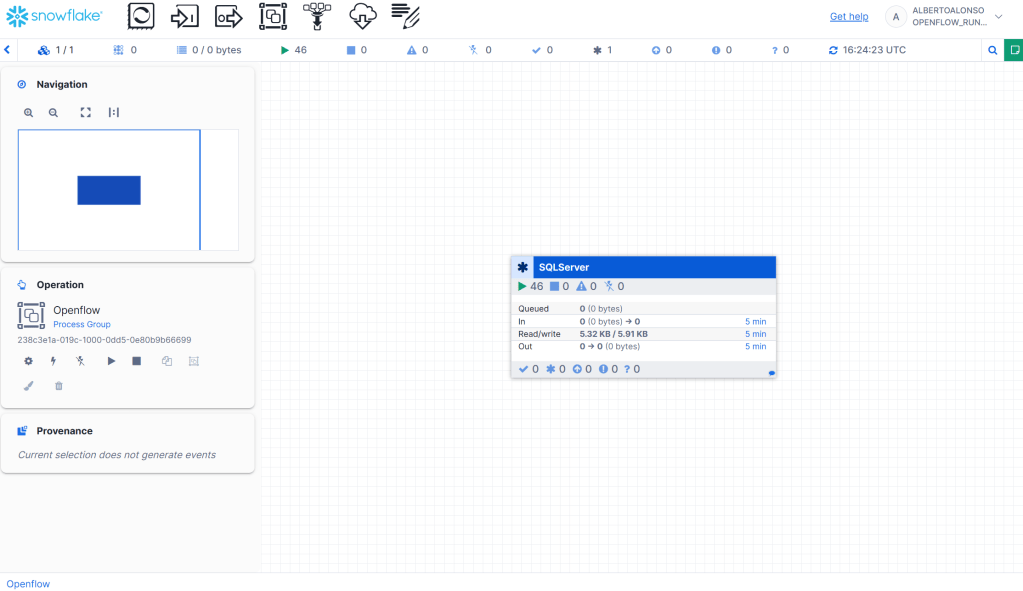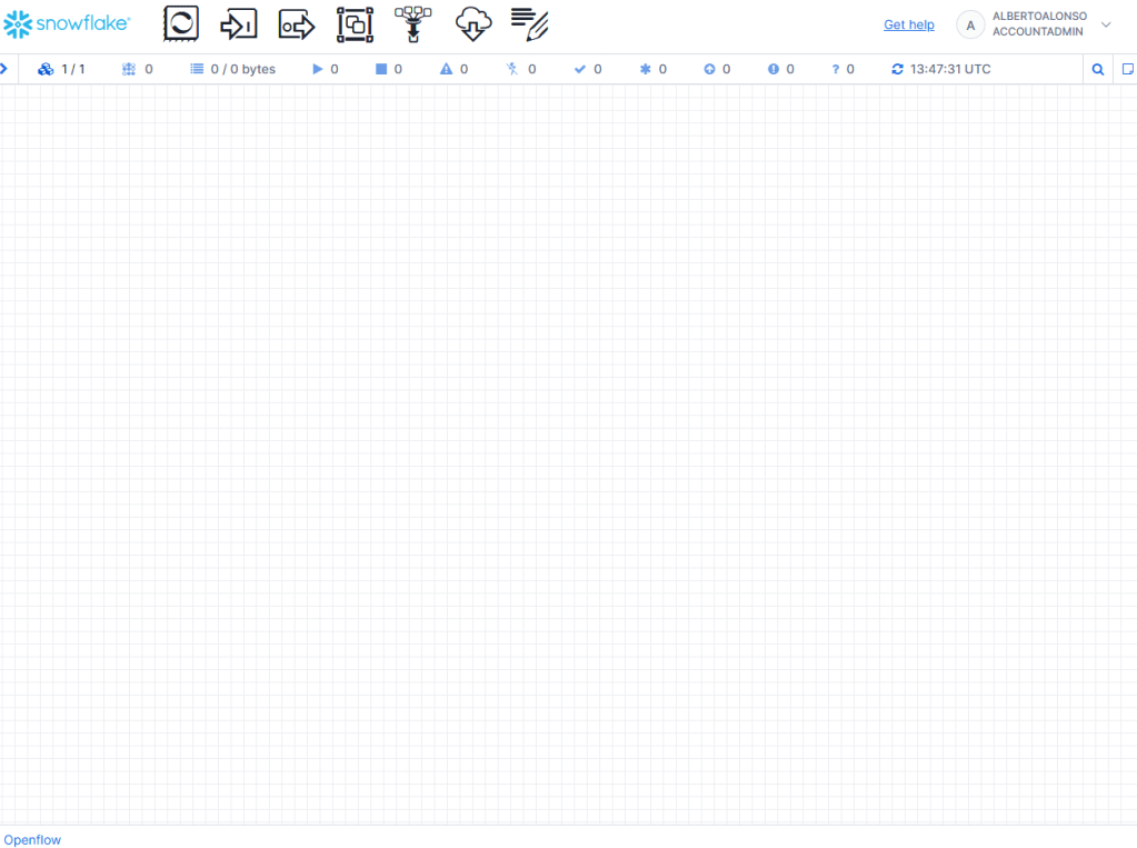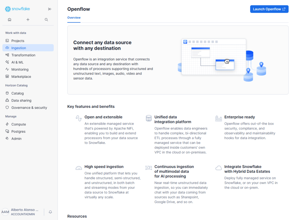 Lo primero es acceder a la cuenta de Snowflake y pulsar sobre el icono de Ingestion en el lateral izquierdo de la interfaz. A continuación, pulsar sobre el botón «Launch Openflow».