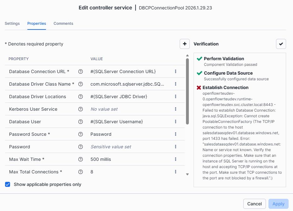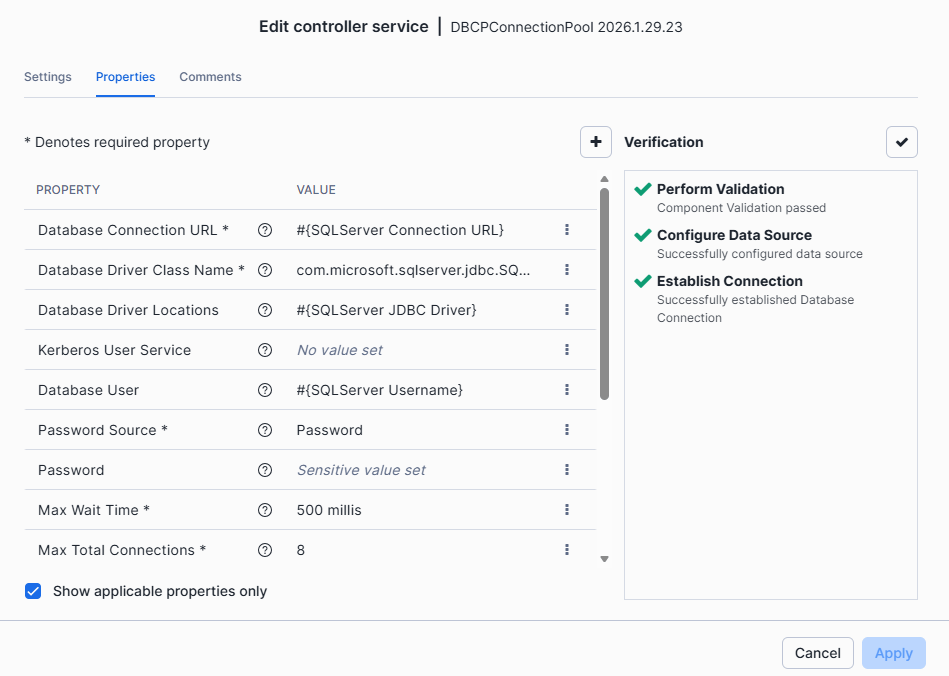 Tras completar la configuración, se recomienda revisar que todo se ha realizado correctamente en los distintos servicios. En este caso se trata de comprobar que los parámetros incluidos del SQL Sever Source Parameters son los adecuados.