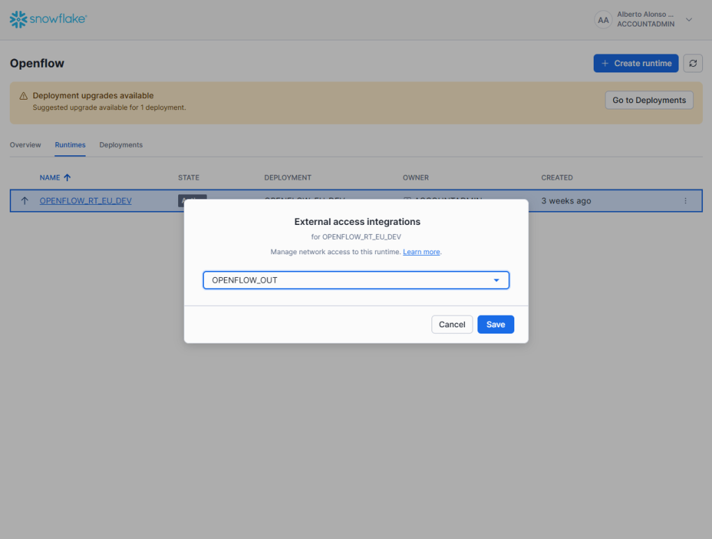 Recuerda que el runtime que emplees haga uso del External Acces Integration que hayas configurado mediante la ejecuión del código previo.