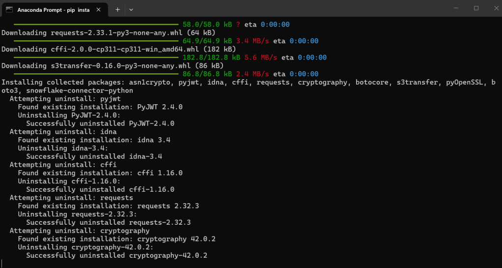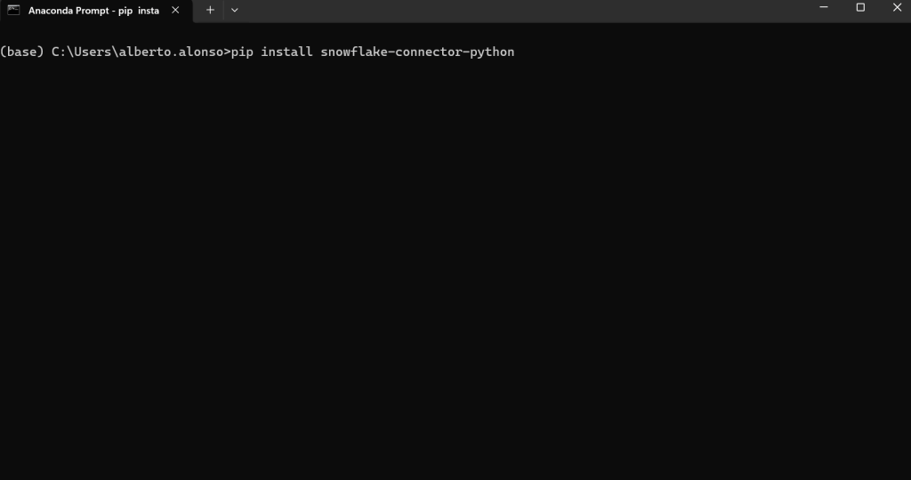 Lo primero es instalar el conector de Snowflake, Para ello, se debe emplear (en mi caso) Conda Prompt y la instrucción pip.