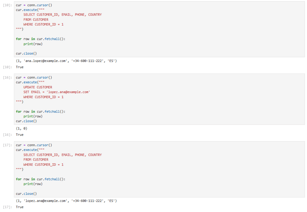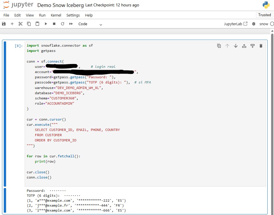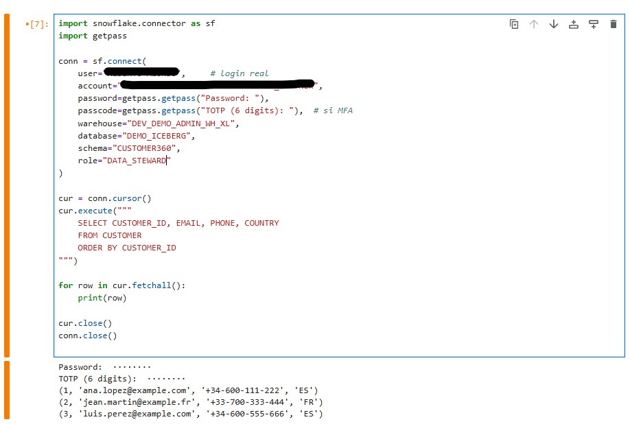 import snowflake.connector as sfimport getpassconn = sf.connect( user="SNOWFLAKE_USER", # login real account="SNOWFLAKE_ACCOUNT", password=getpass.getpass("Password: "), passcode=getpass.getpass("TOTP (6 digits): "), # si MFA warehouse="DEV_DEMO_ADMIN_WH_XL", database="DEMO_ICEBERG", schema="CUSTOMER360", role="ACCOUNTADMIN")cur = conn.cursor()cur.execute(""" SELECT CUSTOMER_ID, EMAIL, PHONE, COUNTRY FROM CUSTOMER ORDER BY CUSTOMER_ID""")for row in cur.fetchall(): print(row)cur.close()conn.close()
